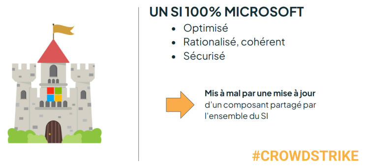 Il y a quelques mois, un évènement comme celui de Crowdstrike a « profité » de cette optimisation (via la mise à jour défaillante d’un composant partagé par l’ensemble du SI) pour avoir un impact sur une grande majorité du parc, avec des conséquences désastreuses : 8,5 millions de PC bloqués ; hôpitaux, aéroports, chaînes logistiques ; la facture dépasse 5 milliards de dollars.