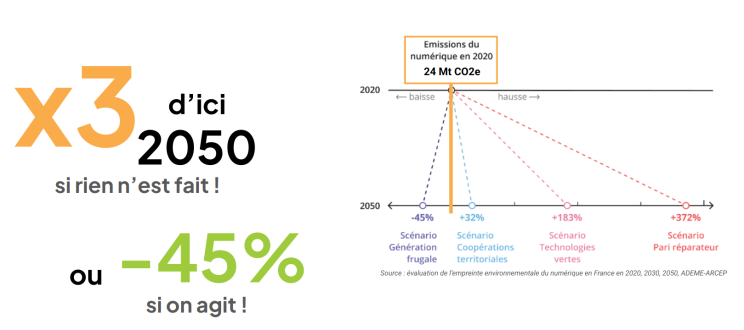 En plus, la tendance de ces impacts est à la hausse ! L’empreinte carbone du numérique pourrait tripler d’ici 2050 !