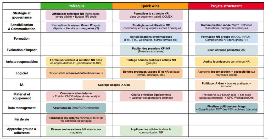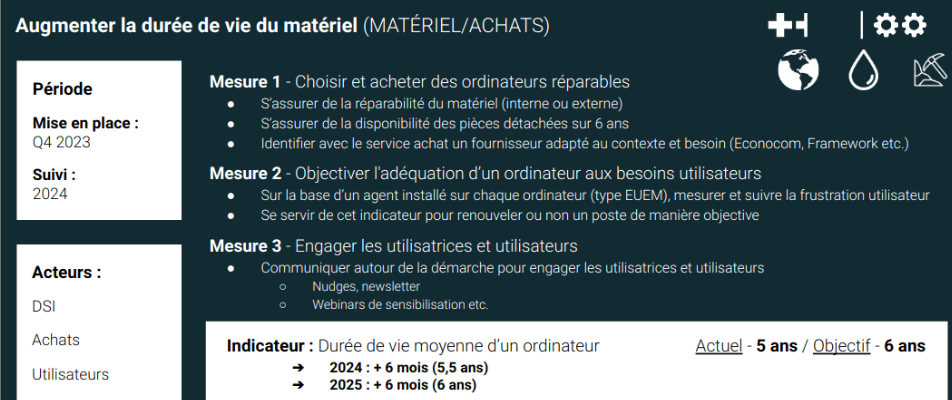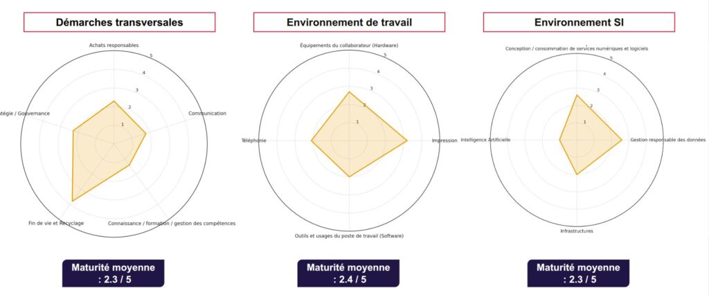 On analyse le parc (équipements, infrastructures, services numériques), les pratiques informatiques, les pratiques d’achat, les politiques de fin de vie etc.